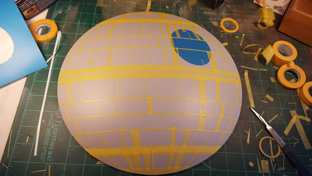 For the Death Star, I explored the possibility of using half of a vintage model kit, but the only existing kit was a poor replica and would have made the shadowbox too deep. I wanted to keep it all under four inches in depth. I eventually decided upon painting the space station myself on the surface of a disassembled security mirror. It took a lot of masking...