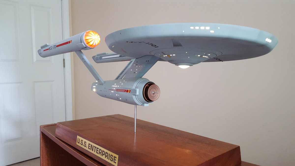 This was my attempt to build a truly spectacular nightlight, the Round2/Polar Lights 1/350th scale U.S.S. Enterprise from the the original television series. This is a very large model, approximately 30 inches long when completed. You can see it above, with a similarly scaled space shuttle Enterprise (actually a bit large, at 1/288th scale). I bought a LOT of stuff to properly light and paint this beast, making it easily the most expensive lamp in our house.