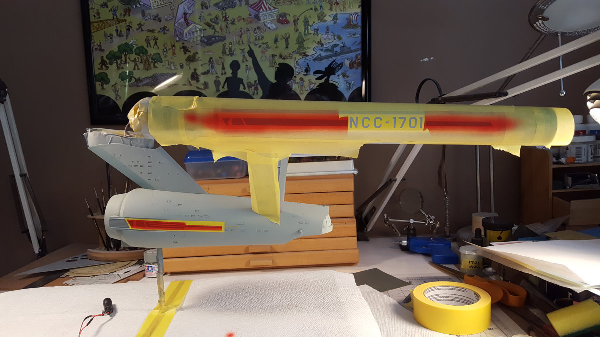 The big 'E' is a very accurate kit, and I wantd the color to be accurate, as well. Fortunately, the Smithsonian recently did a high quality restoration of the original Enterprise model, and one of the restorers was also part of this kit's design team at Round 2. He has graciously shared his findings with the rest of the modelbuilding community, (part of the restoration team even spoke at a panel at Wonderfest, which I attended) so there is no shortage of good information about the model. I did omit a couple details: the paint anomalies on the top of the primary hull (greener tint and 'rust ring'), which I feel were unintended discolorations incurred during the life of the model, and the colorful hull markings on the bottom of the secondary hull (which I accidently wiped out while masking the hull stripes and decided to simply ignore, since they are never visible during the pre-restoration series and cannot be seen unless you crawl on the floor). This photo is me trying to determine the best hull paint mix. The actual hull color is a greenish grey, very close to the color of a vintage Japanese Zero fighter from early WW2.