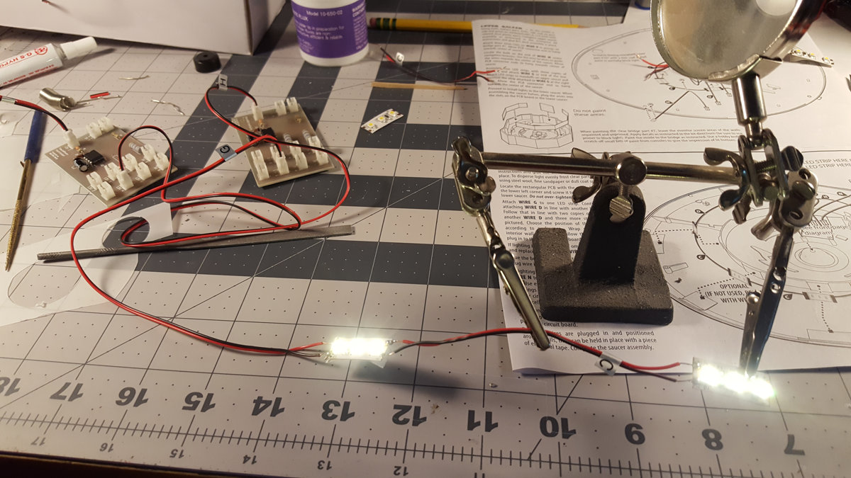 The kit comes with two motors to recreate the spinning fan blades of the glowing bussards. Unfortunately, the little DC motors make a lot of racket, so I installed them, but left them disconnected. I learned the hard way from an earlier C-57 saucer model that spinning lighting effects look awesome for the thirty seconds a day that you can stand to listen to them. Since I wanted the option to leave the lights on for an extended period of time, I decided to live without the spinning fans. I can always reconnect them down the road if I really want to.