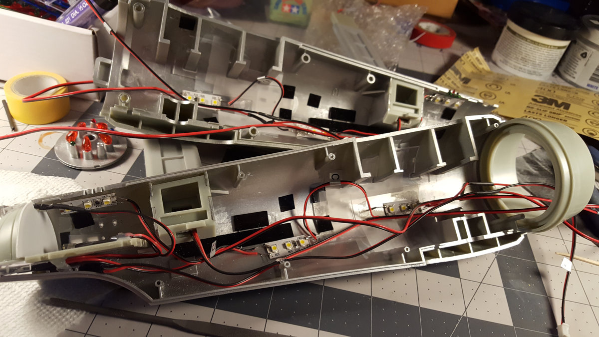 I used Polar Lights own lighting kit to light it, which is relatively easy to install, although I spent a good bit of time removing the notoriously unreliable quick clip connectors and soldering the wires to the LED strips instead.