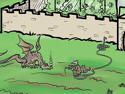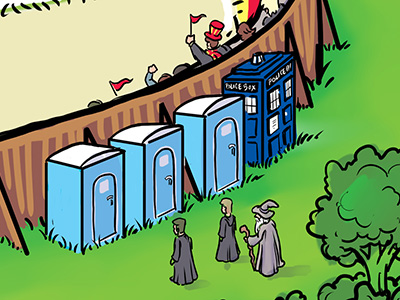 Harry Potter fan art. This was produced as background art for a plinko machine used at the Cincinnati Comic Expo, as part of their Harry Potter themed Geek Prom. This was a BIG piece of art with an enormous amount of detail in it. Most of the principal characters are present, along with a few other wandering wizards that I snuck in (including Gandalf and Dr. Strange). You can even see individual faces in the Quidditch match crowd.