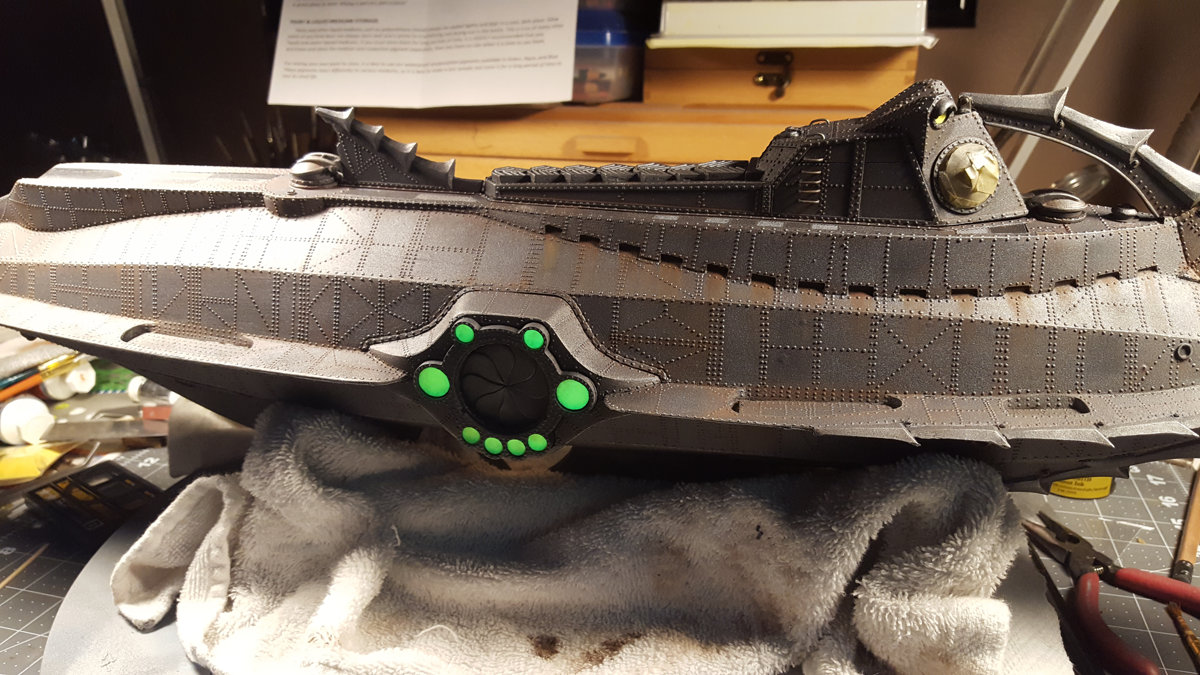 I dispensed with the googly eyes provided to make the hull light lenses, and replaced them with jewelry cabochons. Rather than backlighting them (which involved a lot of drilling, wiring and figuring out how to power it all), I painted the inside of the lights with glow-in-the-dark paint, which creates a ghostly, aquatic-looking light.