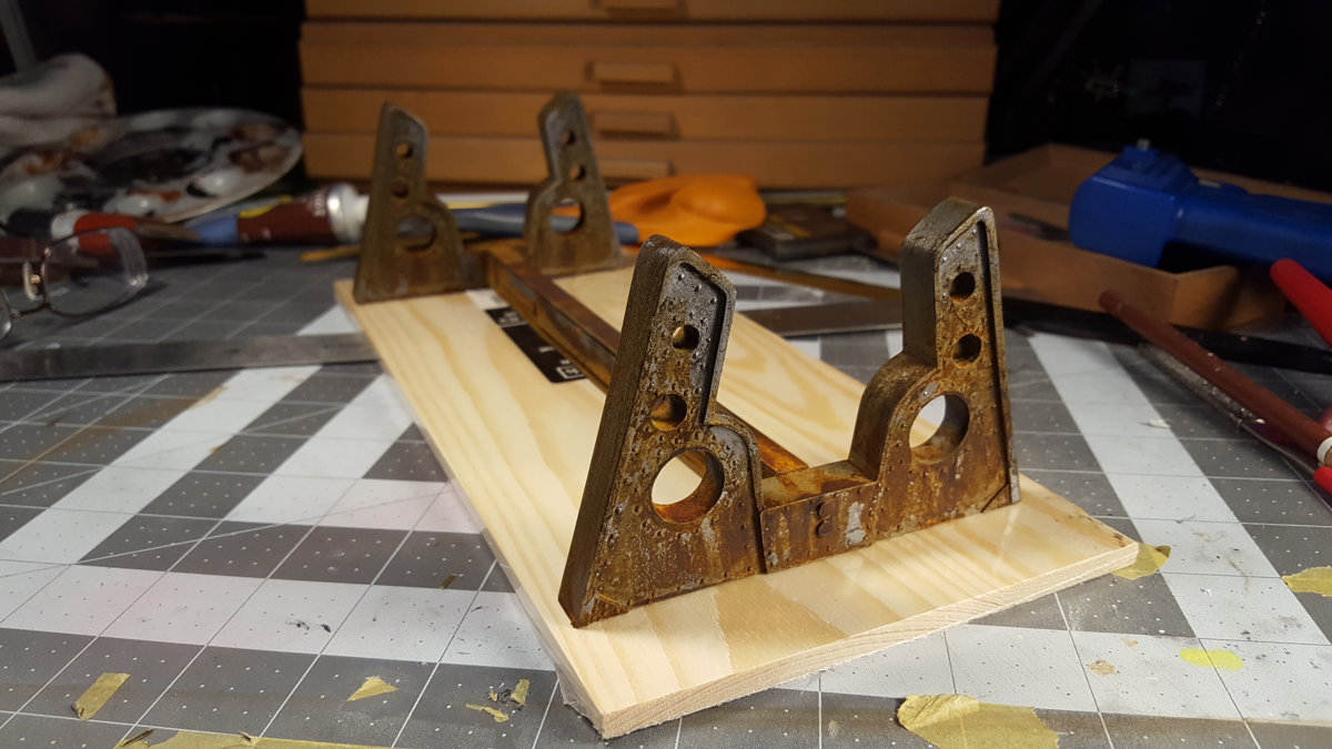 The movie Nautilus is a rust bucket, which is not a look I find very appealing. (The studio model was mostly brass) I opted for a less weathered iron with brass accents. The rust is mostly colored pencil and oil paint.