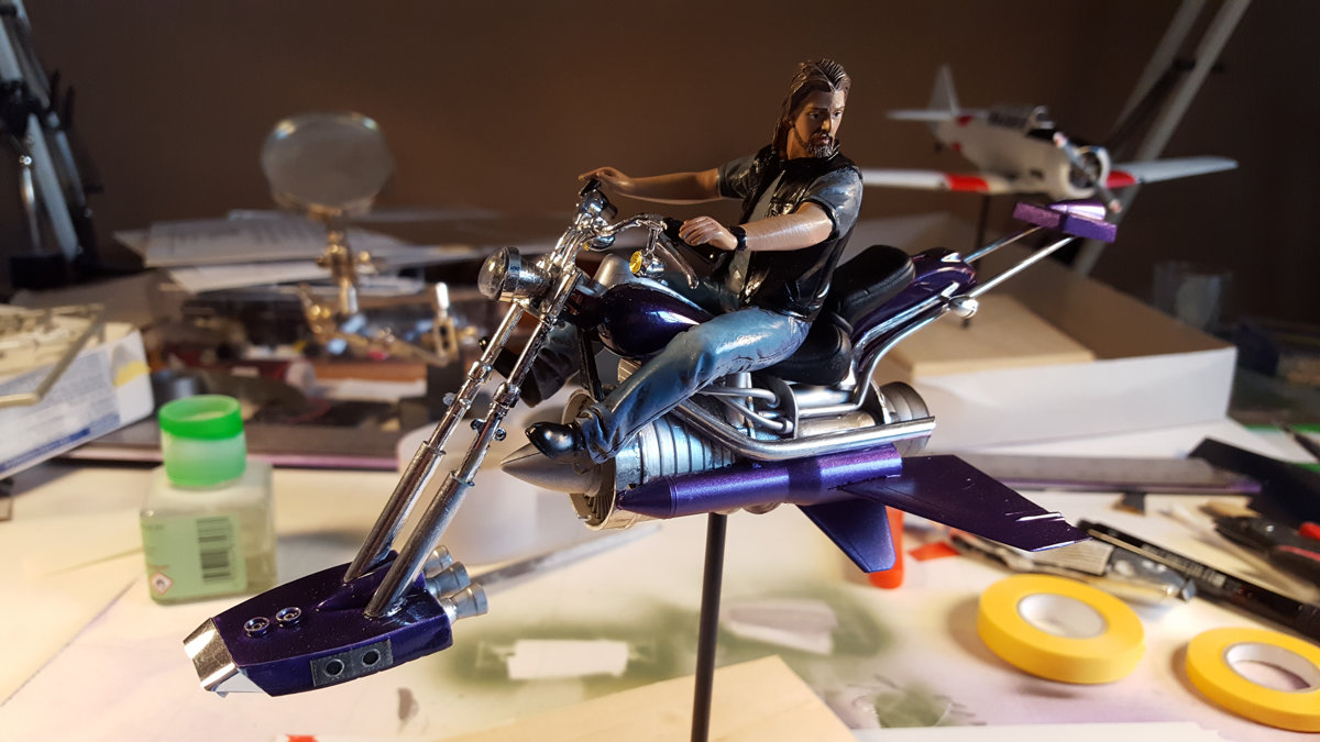 The first thing I did was scratchbuild a bike, cobbled together from all sorts of scrap parts, including an F-86 jet engine and a Maisto bike.