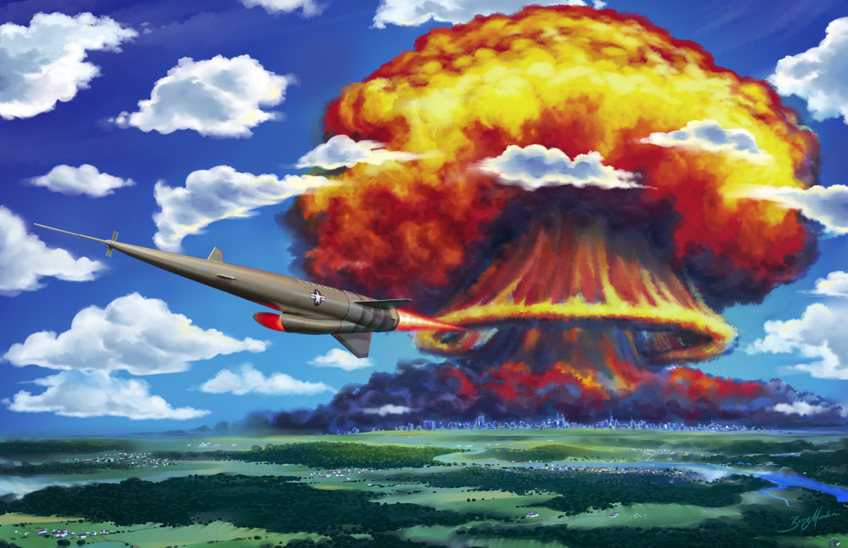 This is a blend of illustration and model photography, which is something I have been enthusiastically exploring. It is a resin model kit of Project Pluto, a stillborn weapons program of the USA during the cold war. Pluto was a supersonic cruise missile designed to deliver over a dozen nukes and powered by a nuclear ramjet. The unshielded nuclear powerplant was considered a secondary weapon, but it proved impractical to safely flight test, and ICBM development rapidly superceded it, so the project was mercifully shelved. I photographed the model in front of a rear-projected image of some of my art, then digitally painted out the support stand. The superheated red glow of the ramjet intake was created by shoving an LED taped to a coin cell into it. (It's still in there, somewhere)