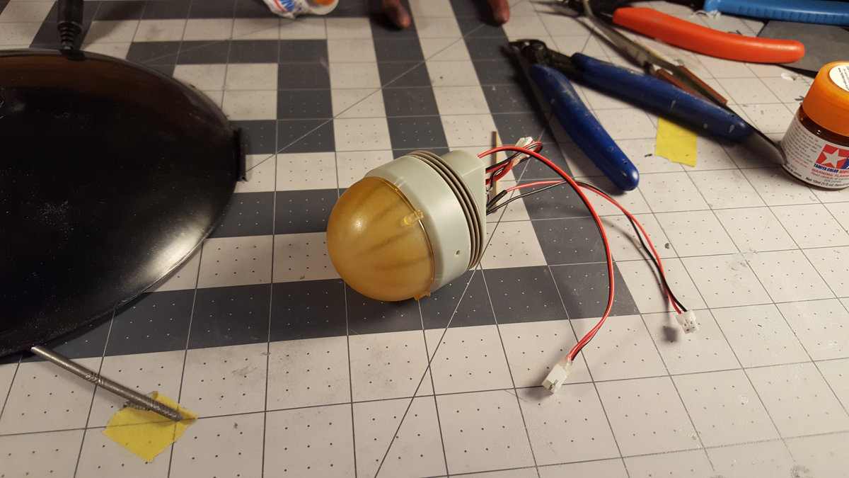 The kit comes with two motors to recreate the spinning fan blades of the glowing bussards. Unfortunately, the little DC motors make a lot of racket, so I installed them, but left them disconnected. I learned the hard way from an earlier C-57 saucer model that spinning lighting effects look awesome for the thirty seconds a day that you can stand to listen to them. Since I wanted the option to leave the lights on for an extended period of time, I decided to live without the spinning fans. I can always reconnect them down the road if I really want to.