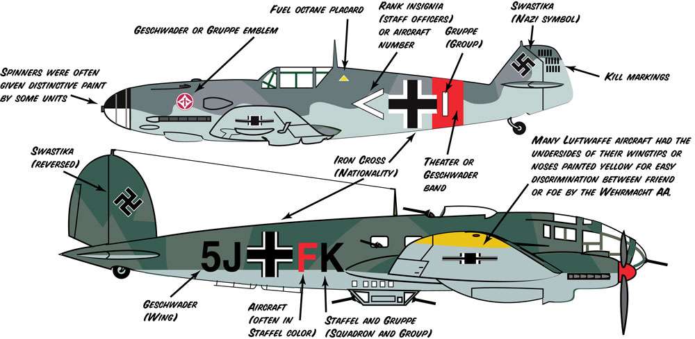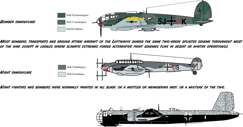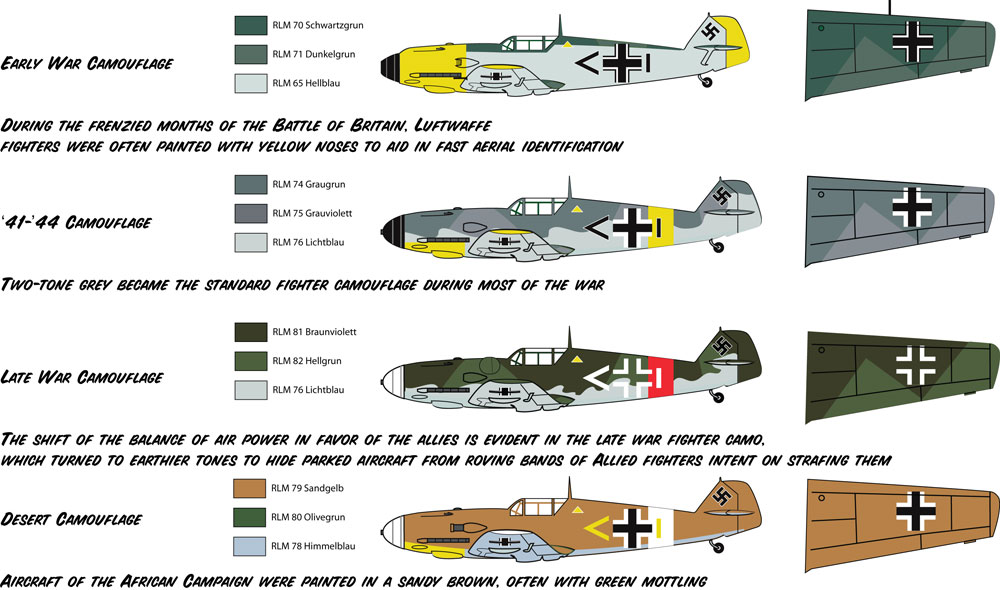 Thanks to the German propensity for documenting everything, a great wealth of information regarding Luftwaffe camouflage exists today, and can easily be found on the web. The magic keyword is "RLM". Some great reference sites are the IPMS Stockholm website, Hyperscale's Digital Color Charts and The Luftwaffe in Scale. Those of you interested in deciphering the unit codes on the fuselages of Luftwaffe aircraft will find a treasure trove of information at The Luftwaffe in Scale site, and some helpful hints at modelingmadness.com