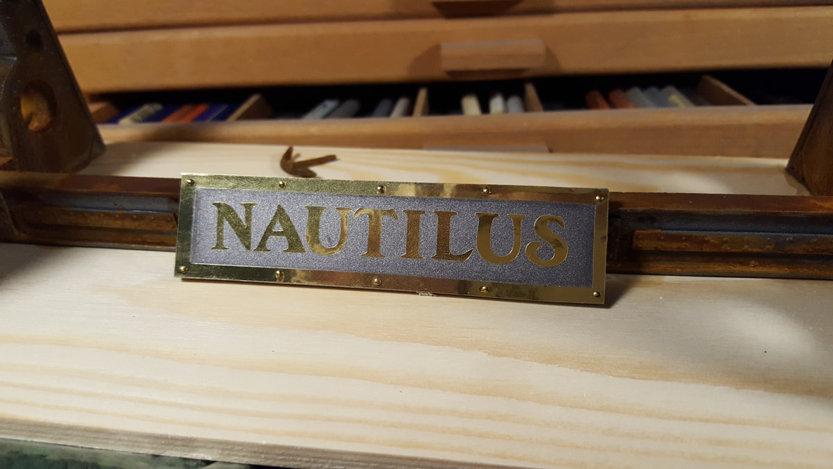 I made a plaque from sheet styrene, metallic vinyl and dollhouse nails (for rivets)