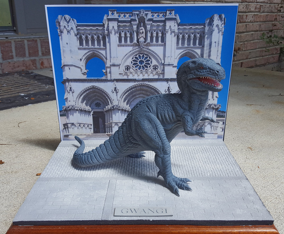 This is Gwangi, a resin kit sculpted by the brilliant Joe Loudati. Gwangi is the star of the Harryhausen flick, "Valley of the Gwangi", and is shown here rampaging in front of the Cuenca Cathedral in Spain, where the movie was filmed.