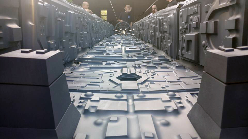 The trench itself was constructed from wood and PVC pipe, and designed to break down and fold up for transport on three custom built carts. The surface detail of the Death Star was vacuformed from plastic in two foot square tiles, which were screwed to the wooden frame. The electronic sensors and audio system were contributed by Greg Spata, who likes to build robots in his spare time.