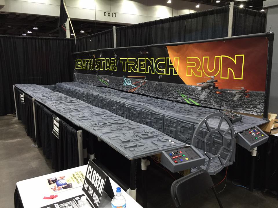 This is a 24-foot replica of the Death Star trench that I designed and built (with the help of many good friends) for the 501st Legion to use to raise money for charity at the Cincinnati Comic Expo. Patrons were invited to fly an radio-controlled x-wing down the trench and try to drop their proton torpedoes (two small pastic spheres lit with LED's) into the thermal exhaust port. As they flew down the trench, various motion and pressure sensors would play appropriate sound bites from the movie.